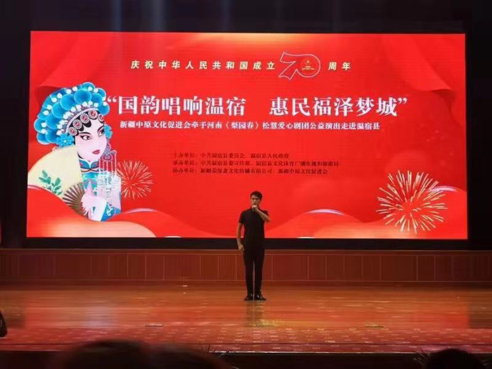 粉墨缤纷,同唱梨园欢歌;霓裳锦绣,迢迢友谊长河。8月24日,由中共温宿县委、县政府主办的庆祝中华人民共和国成立70周年“梨园唱响温宿 惠民福泽梦城”河南《梨园春》松慧爱心剧团文化惠民演出在新疆温宿县文化艺术中心火热上演。浓郁的地方色彩、朴实的生活气息、鲜明的时代精神深深吸引着现场观众,掌声如雷的现场为此次阿克苏地区系列惠民演出划上了圆满的句号。