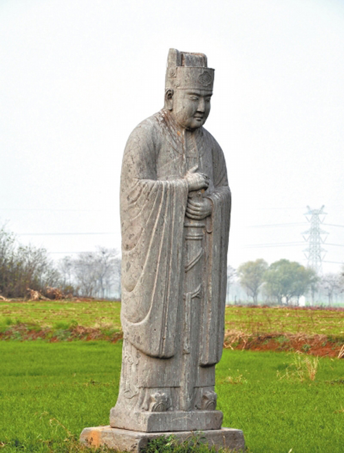 汉唐石雕,追求粗犷神似,宋代则突出细腻和精致,形象传神,成为中国古代雕塑发展史上的巅峰之作。宋陵石像生,一改汉唐时期粗壮近乎臃肿的比例,变得身材修长,脸形俊秀,面部如额骨、额丘、眉弓、下颌、双手等处,都做细微刻画,着力突出不同人物身份的相应情态,如文臣之雍容大度,客使之悲恸凄怆,镇陵将军之内在力量。衣纹也反映出体态变化与形体转折,特别是衣冠的配饰,如同写真,为人们了解宋代服饰提供了难得的参考。