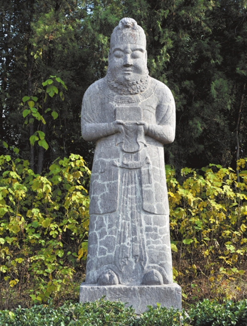 每个帝陵的石刻群中,都有三对“客使”,这些人物形象,别具一格。宋代对外实行结盟政策,外族使节来往频繁。宋初时,太宗永熙陵的客使风格朴质,中期进入盛世,仁宗永昭陵的客使,则完全是另一种气象,他们双手捧贡品,身披大袍,凸显朝觐仪式的盛大庄重。此外,文臣武将也不再是没有表情的石俑,在石像生的面部刻画上,着力表现眉端紧锁、两眼向下、不胜悲戚之状,甚至从背影看,也能感受到那种哀悼的情绪,内心刻画极为深刻。