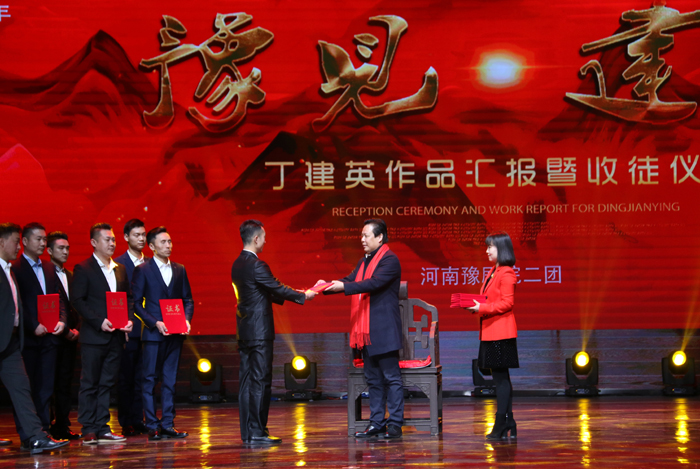 戏曲是中华民族传统文化中的瑰宝之一,是宝贵的非物质文化遗产,它的薪火传承离不开艺术家的谆谆教导和口传心授。活动现场,来自焦作市豫剧院康建广、漯河市豫剧团刘少武、开封市豫剧院副院长魏占桥、漯河市豫剧团周杨威、商丘市豫剧院张永杰、河南豫剧院二团连彩芬、王馨帅,中国平煤神马集团豫剧团业务团长韩晓伟、河南明星擂主大爱剧团演员胡磊、洛阳豫剧院演员席宁宁、新乡市豫剧团演员刘坤、登封市豫剧团祁元杰,共12名弟子正式拜在丁建英门下。