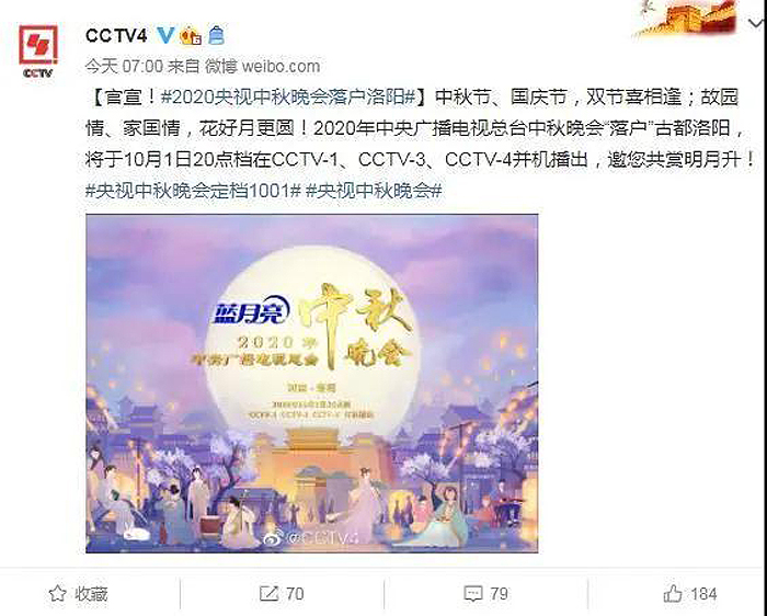 9月4日,记者获悉,CCTV-4官方微博正式宣布,2020年中央广播电视总台中秋晚会“落户”古都洛阳,将于10月1日20点档在CCTV-1、CCTV-3、CCTV-4并机播出。