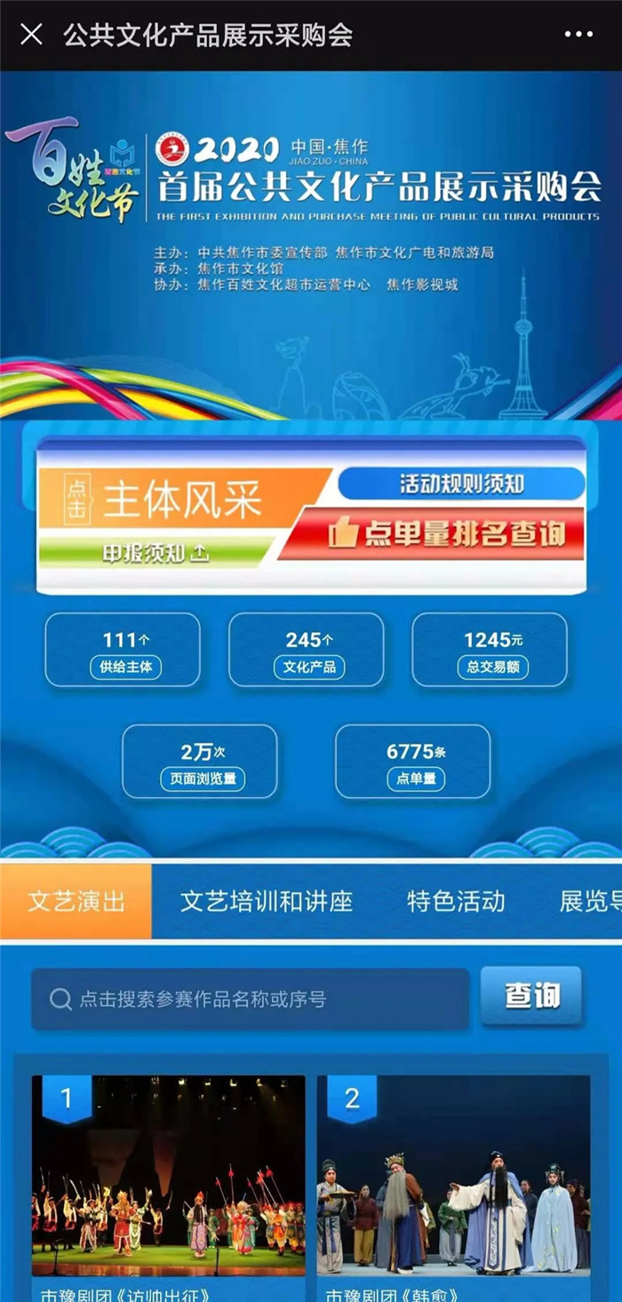 11月22日,焦作市“百姓文化节”暨首届公共文化产品展示采购会(简称“文采会”)在焦作影视城举办,吸引了焦作、郑州、洛阳、北京、上海、陕西等地的200余家公共文化产品供给主体的热情参与,现场签约并达成意向订单约1300万元。