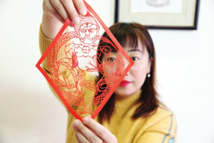 传承人陈艳清展示纸雕作品《戏蛇力士》