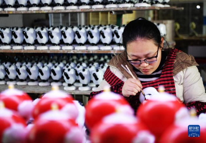 工人为陶瓷“冰墩墩”“雪容融”上色